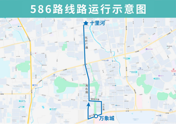 586路由十里河开往万象城,主要途经花园东路、化纤厂路、海右路、解放东路、山左路、经十路。沿途设置十里河、化纤厂路康虹北街、化纤厂路华能路、化纤厂路华龙路、保利珑誉(路西)、化纤厂路工业南路(路东)、海右路子云街、海右路新泺大街、海右路南丰街、万象城(路北)、海右路经十路(路东)、海右路解放东路(路东)、海右路坤顺路(路东)站点。