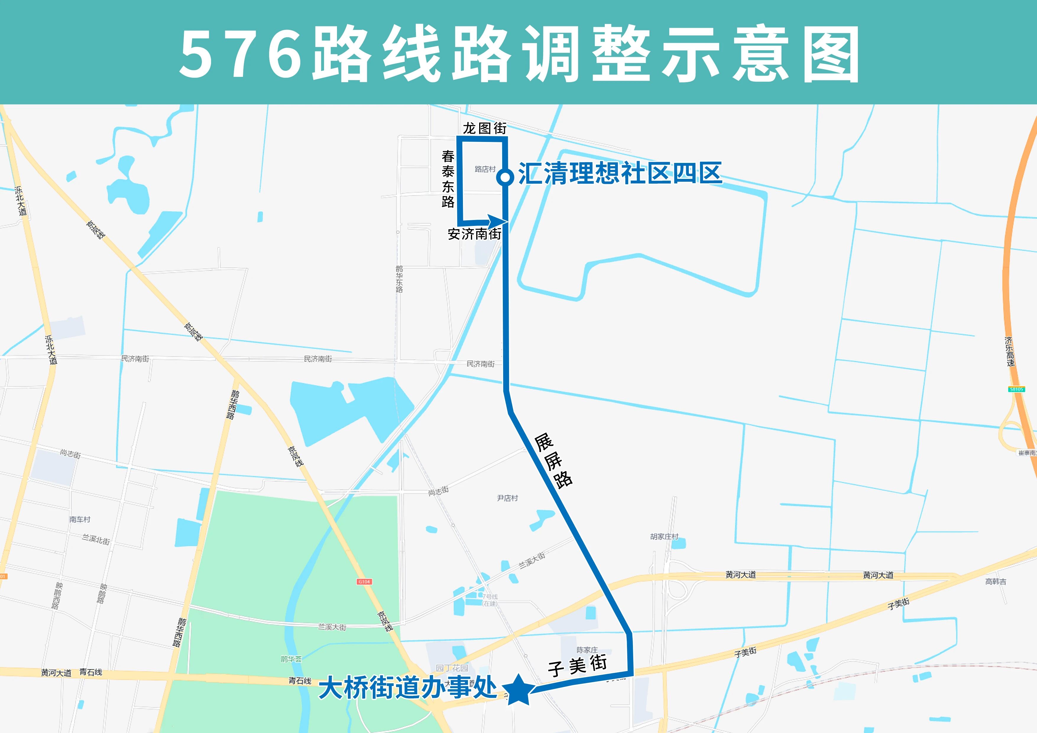 576路优化调整后由大桥街道办事处开往汇清理想社区四区,主要途经子美街、展屏路、龙图街、春泰东路、安济南街、展屏路,沿途增设汇清理想社区四区(路东)、汇清理想社区一区(路北)、汇清理想社区五区(路西)、汇清理想社区八区(路南)站点,撤销马家店北、甜水新村、鹊华九里居站点。