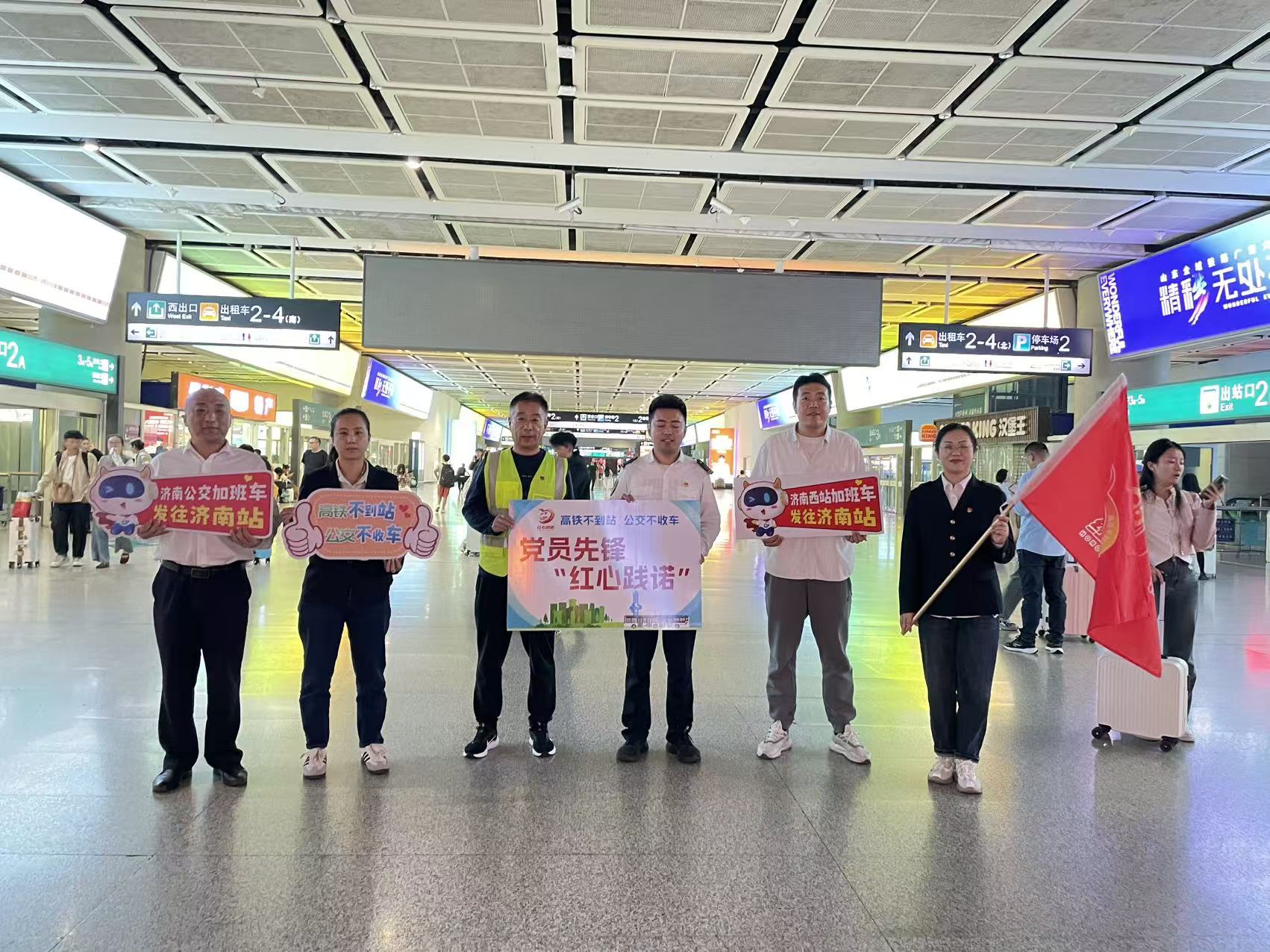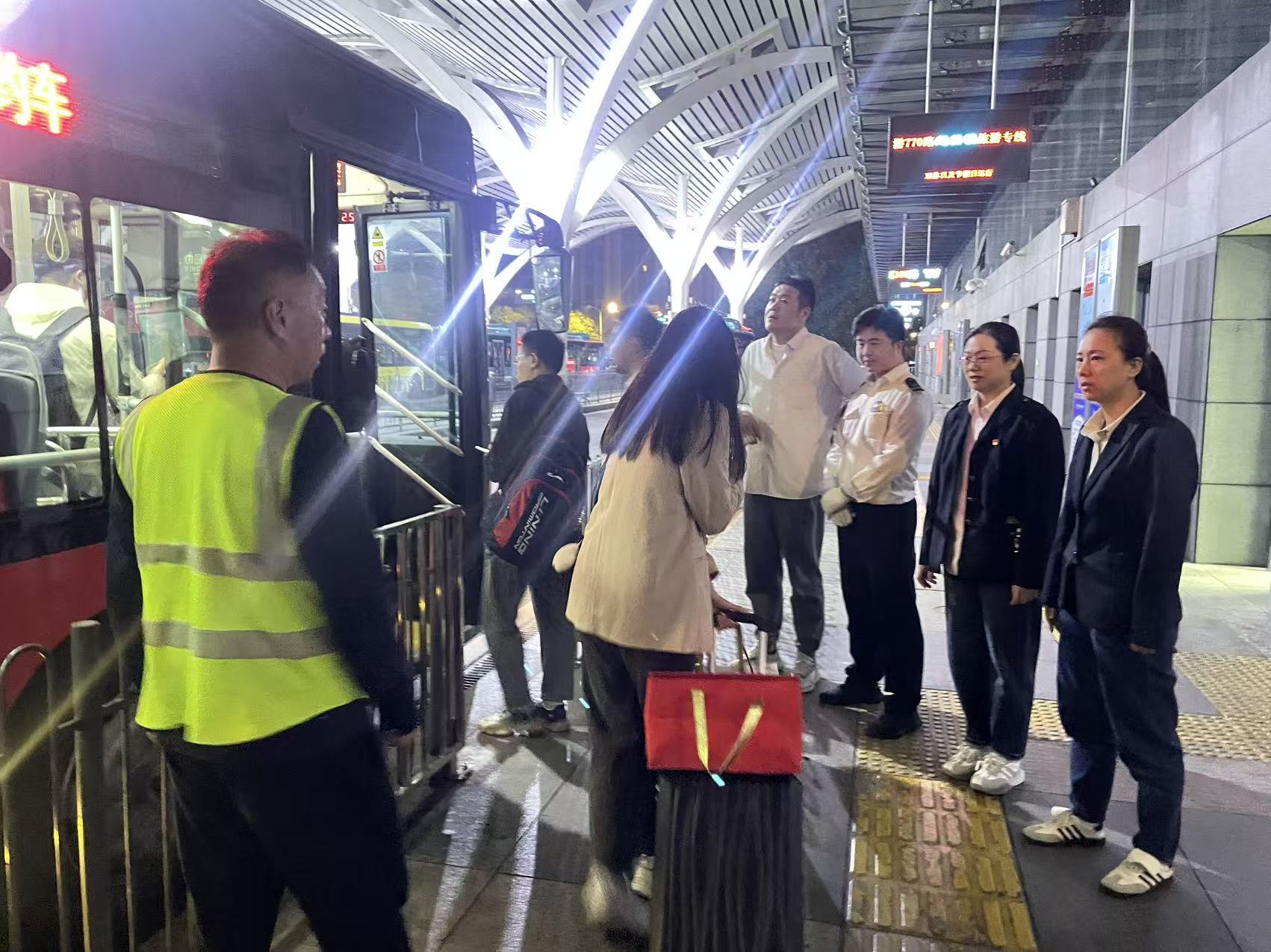 日间运力投入上,济南公交西部分公司四队动态加密K109、K202路等4条重点线路班次,高峰时段发车间隔压缩至5-6分钟。夜间出行保障上,依托“联勤+党建”双驱机制,24小时精准对接列车动态,实现旅客高效疏散的基础上,凝聚党员力量,积极参加高铁临客接驳疏散任务,践行“高铁不到站,公交不收车”承诺。党员驾驶员郑慧、吕鑫手持标识牌,主动前往济南西站出站口迎接旅客,清晰引导乘车方向;另一边,驾驶员于星火、刘玉泉早早在公交站台等候,耐心指引旅客有序乘坐加班车,确保客流快速疏解。