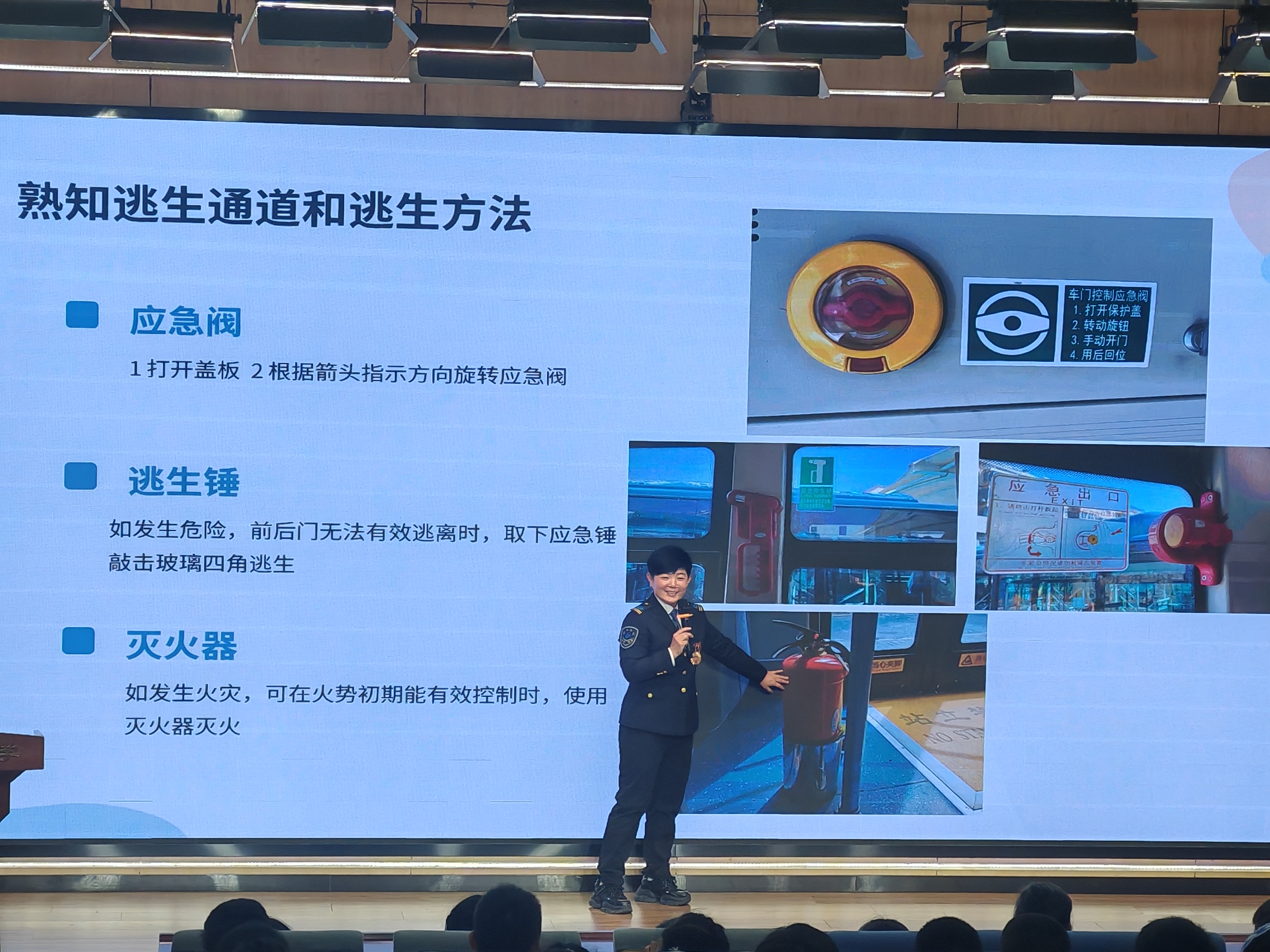 活动现场,董丹讲述了十米车厢里智斗歹徒保障乘客安全的生死考验。南部分公司六队孟苓菲化身“安全讲师”,用生动有趣、通俗易懂的语言,结合小学生的认知特点,向同学们详细讲解了安全乘车知识。在孟苓菲的讲解下,同学们认识了济南的公交车,了解了乘车时的注意事项以及安全逃生的方法。孟苓菲着重强调了未满12周岁严禁骑行自行车、未满16周岁严禁骑行电动车、未满18周岁严禁骑行摩托车的相关规定,通过列举真实案例,让同学们深刻认识到违反这些规定可能带来的严重后果,切实提升同学们的安全意识。此外,孟苓菲还对候车、上下车以及乘车过程中的安全注意事项进行了细致讲解,提醒同学们乘车时不要追逐打闹,避免发生意外。通过展示济南公交车厢内的服务设施贴,直观地让同学们对公交车上的安全设施有了更深入的了解,也掌握了基本的应急逃生技能。