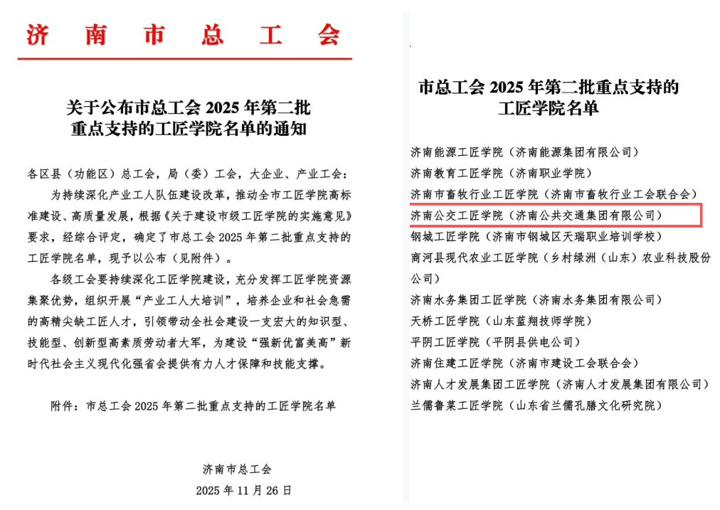 济南公交官网讯 11月26日,济南市总工会正式发布了《关于公布市总工会2025年第二批重点支持的工匠学院名单的通知》,济南公交工匠学院凭借卓越的培训体系和显著的培训成效成功入选,这标志着学院的发展迈入了全新阶段。