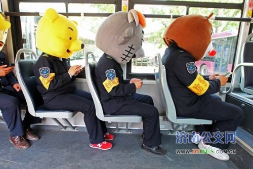 ▲公交司机穿上卡通装,假扮还原一乘客边看手机边上车误将100元当1元投入票箱的场景。 (本报记者 杨宁 摄)